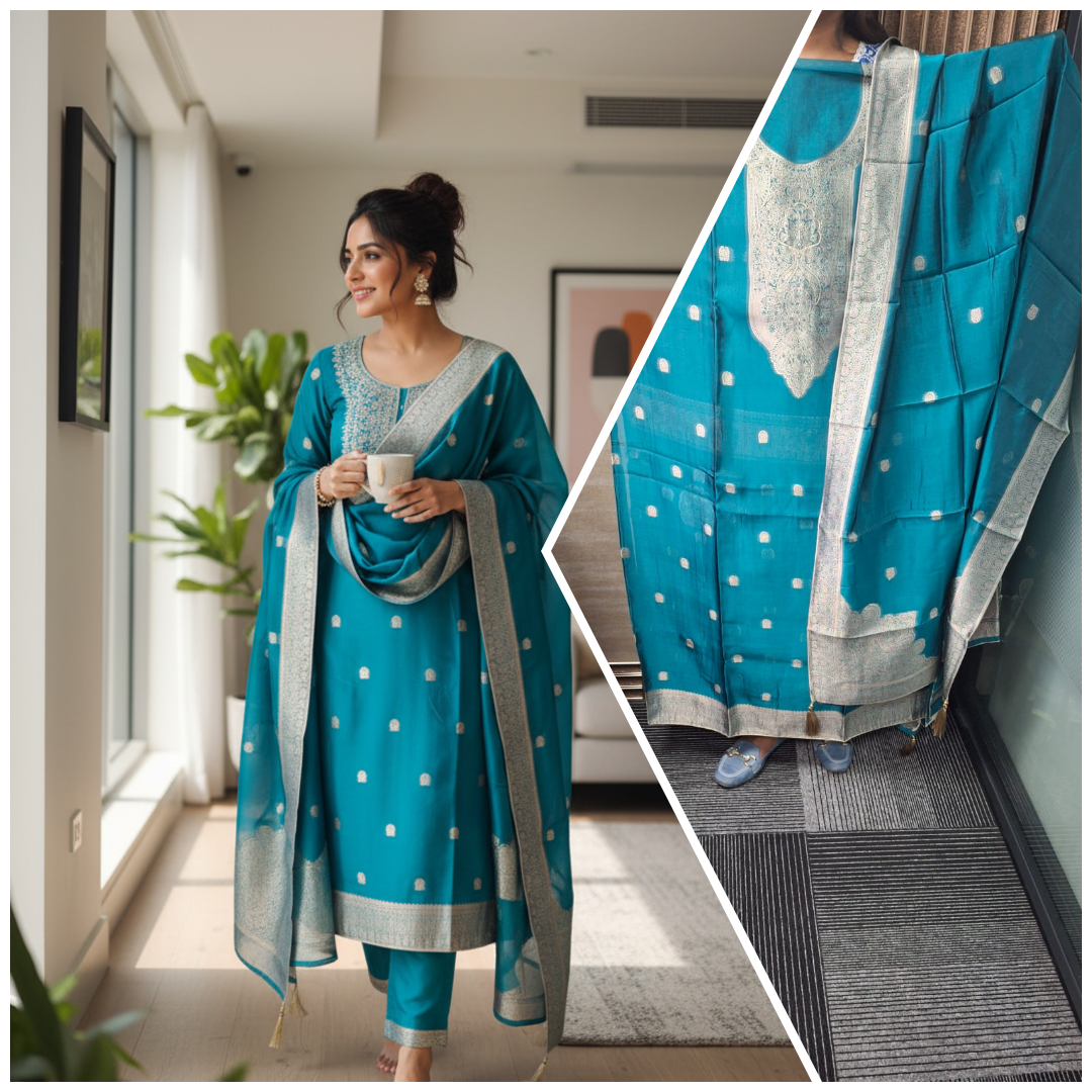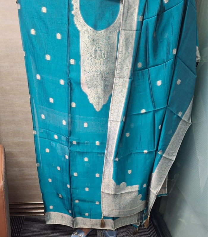 Blue Color Pure Chanderi Unstiched Suits With Banarsi Weaving Nack with Boota & Border Back-Big Banarsi Boota Bottom-Plain as same base color of shirt duppta full lenght with banarsi boota & border