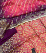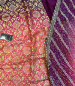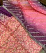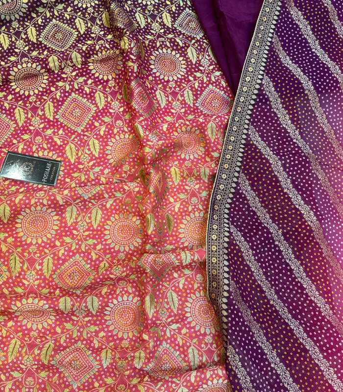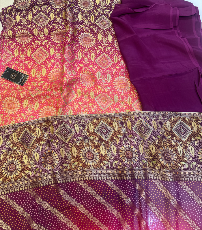 PURE GORGET UNSTITCHED SUITS BHANDHNI PRINT ZARI RESHAM WEAVING WITH DUPATTA FULL LENGTH LEHARIYA WITH BORDER BOTTOM PURE CEREP PLAIN COLOUR PURPLE AND PEACH ORANGE